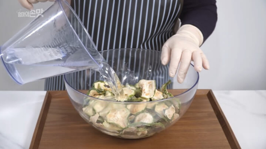 너무 오래 불리면 호박이 물컹해져서 맛이 떨어지니 주의하고, 불린 후에는 찬물로 여러 번 헹궈 묵은 냄새를 제거해 주세요.