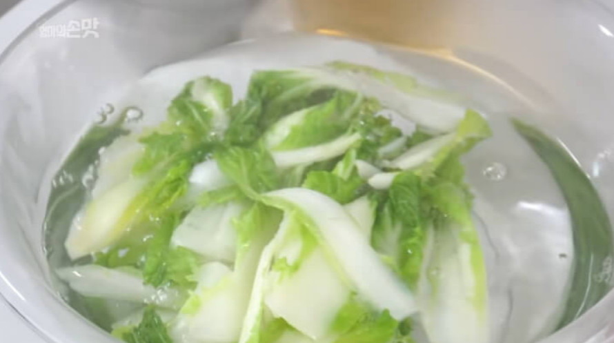 봄동을 데칠 때는 너무 물러지지 않도록 주의하며, 중간에 한 번 뒤집어주고 봄동이 약간 휘어질 정도로만 데쳐주세요. 이렇게 하면 무쳤을 때 아삭한 식감을 살릴 수 있어요.