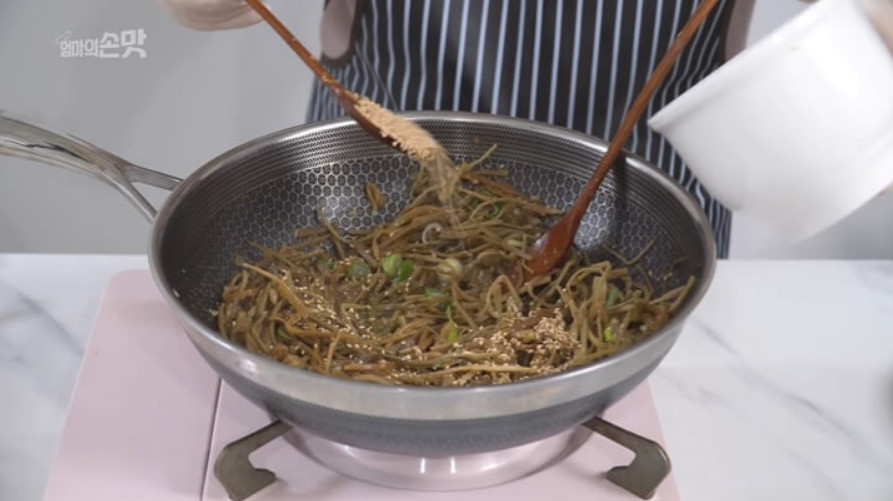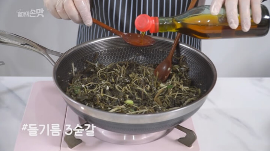 취나물에는 약간의 수분이 남아 있어야 촉촉하게 즐길 수 있어요. 대파 2스푼을 넣고 볶다가 대파가 숨이 죽으면 불을 끄고, 들기름 3스푼과 참깨 2스푼을 넣어 잘 섞어주세요.