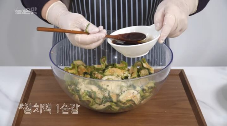 그 다음, 국간장 2스푼, 참치액 2스푼, 다진 마늘 2스푼을 넣고 잘 버무려줍니다. 간이 싱거운 경우에는 국간장을 추가해 간을 맞추면 좋아요. 건취나물은 국간장으로 간을 해야 더욱 맛있답니다.