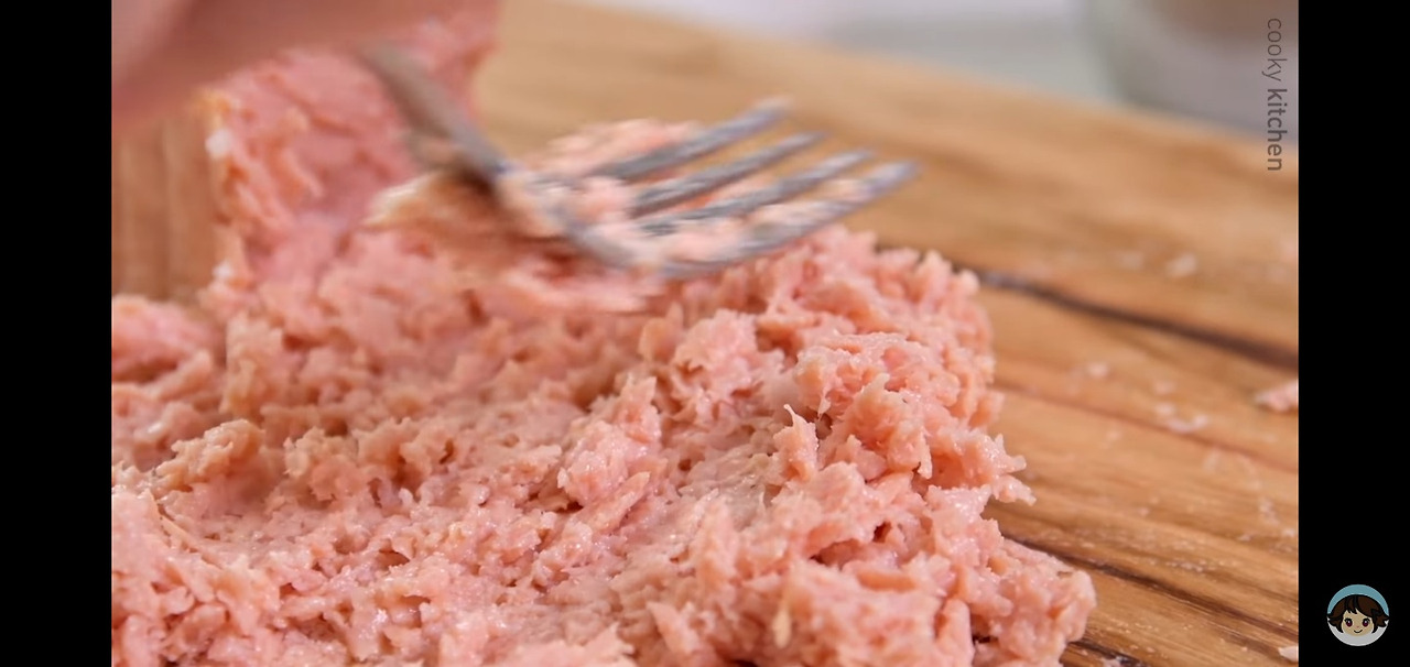 스팸은 100g 정도(작은 스팸의 절반 양)를 포크로 눌러가며 잘게 으깨주세요. 스팸이 들어가느냐 마느냐가 오늘 김치볶음밥의 맛을 결정짓는 중요한 포인트인 것 같아요!