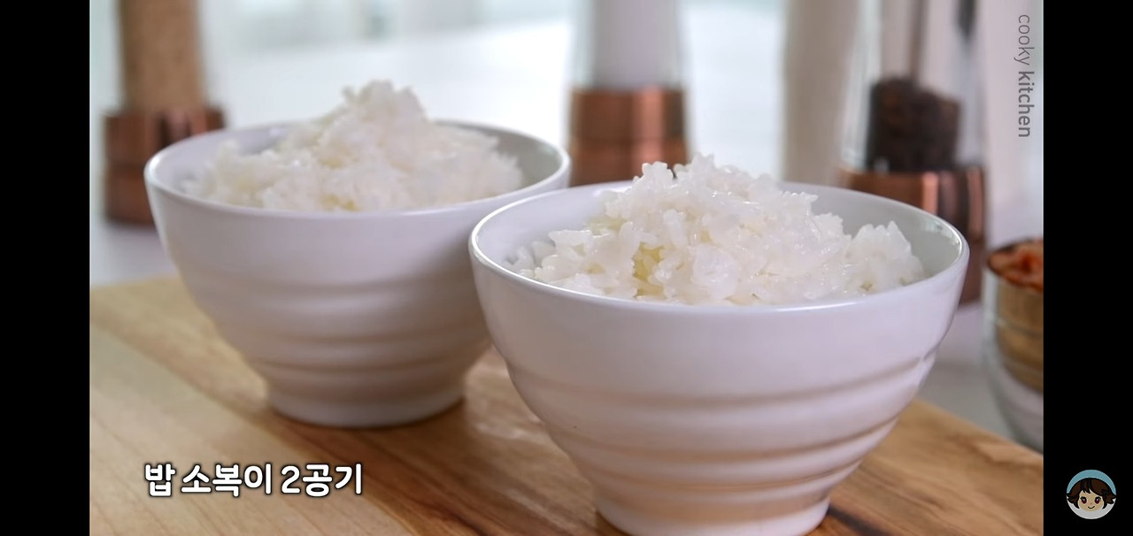 밥 두 공기를 소복하게 준비해두면, 오늘 김치볶음밥을 맛있게 만들기 위한 재료 손질이 완벽히 마무리돼요.