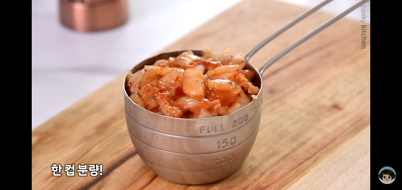 김치는 썬 후에 종이컵으로 한 컵 정도 준비하면 딱 좋아요. 이때 김치국물을 넉넉히 함께 넣으면 훨씬 깊은 맛이 살아있는 김치볶음밥을 즐길 수 있답니다!