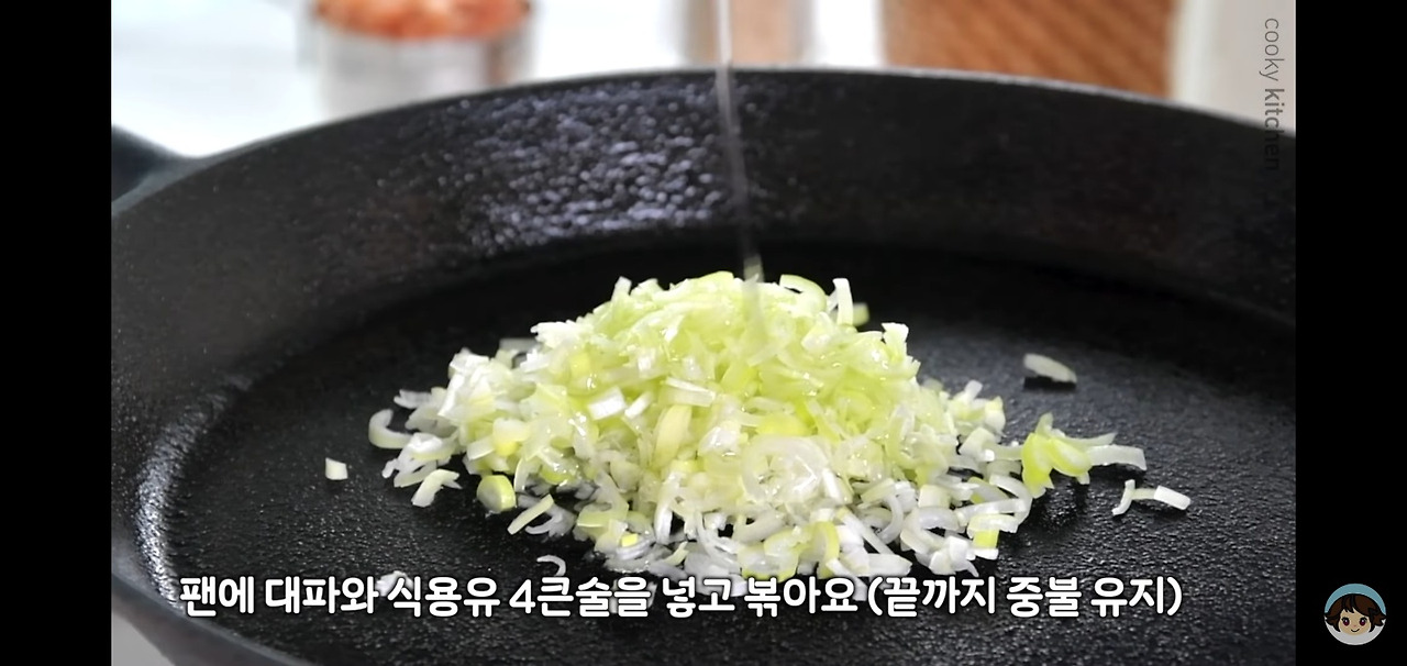 먼저 중불로 예열한 팬에 식용유 4스푼을 두르고, 다져둔 대파를 넣어 볶아주세요. 요리하는 내내 중불을 유지하면서 볶아주는 게 좋아요.