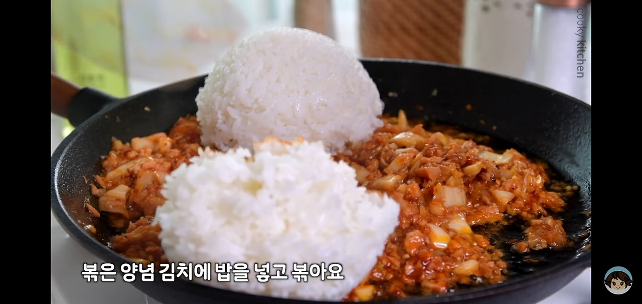 이제 본격적으로 김치볶음밥을 완성할 차례예요. 잘 볶아진 김치 양념에 밥을 넣고 골고루 볶아주세요.
