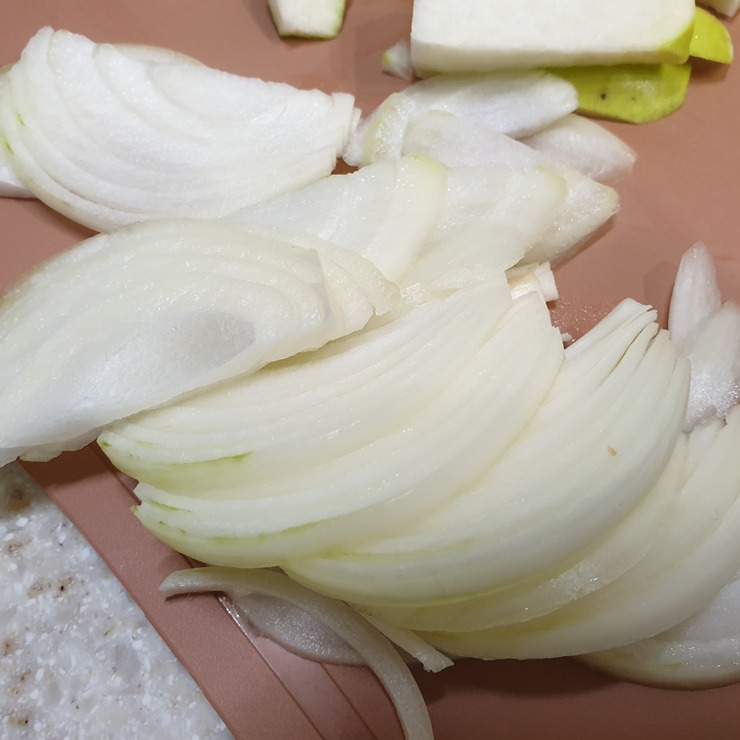 4. 양파 1/2개는 채 썰고, 대파는 송송 썰어 주세요.