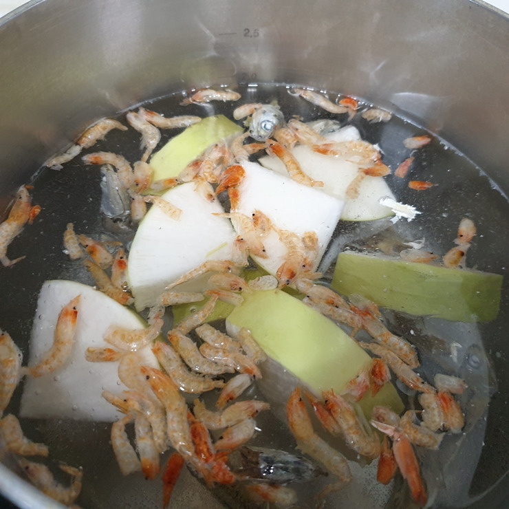 1. 물 2L에 내장을 제거한 국물용 멸치 15마리, 보리새우 한 줌, 그리고 무 8조각을 넣고 끓여주세요. 육수 전용 다시팩을 사용해도 괜찮습니다.