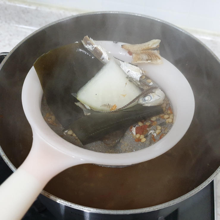 6. 재료 준비가 끝나고 육수를 끓인 지 20분 정도 지나면 다시마를 넣고, 중불에서 10분 정도 더 끓인 후, 육수에 사용했던 재료는 체로 걸러내세요.