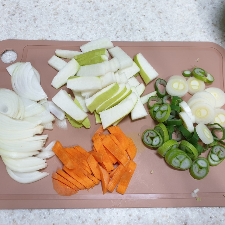 3. 무는 길쭉하거나 넙적하게 썰어 주세요. 당근도 무와 비슷한 크기로 썰어 주세요.