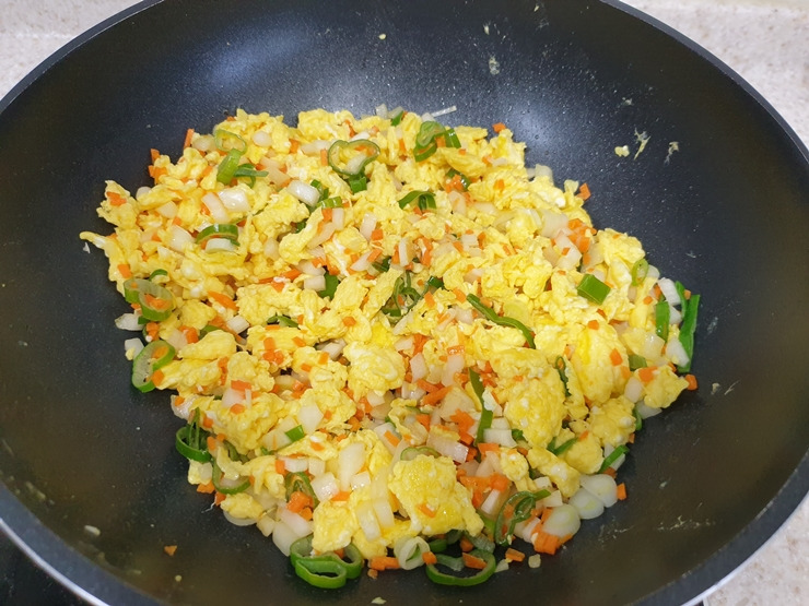 계란이 다 익으면 미리 다져둔 야채를 넣고 센 불에서 약 5분 정도 볶아주세요. 야채에서 나오는 수분이 익힌 계란과 자연스럽게 섞여 맛이 잘 어우러질 거예요.