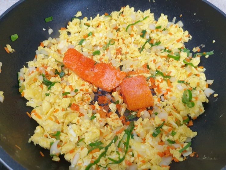 야채가 익었다 싶으면 날치알을 넣어주세요. 날치알이 없다면 새우나 햄 같은 다른 재료를 활용해도 좋아요. 냉동 날치알이라면 약불로 줄이고 잠시 두어 재료가 자연스럽게 녹도록 하는 것도 좋답니다.