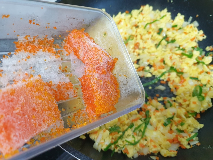 계란 볶음밥 만드는법 ③ 부가재료 넣어 주기(날치알 또는 새우 또는 햄등)