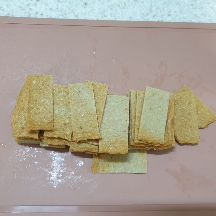 1. 납작한 오뎅은 반으로 길게 자른 후, 6등분 정도로 잘라줍니다.