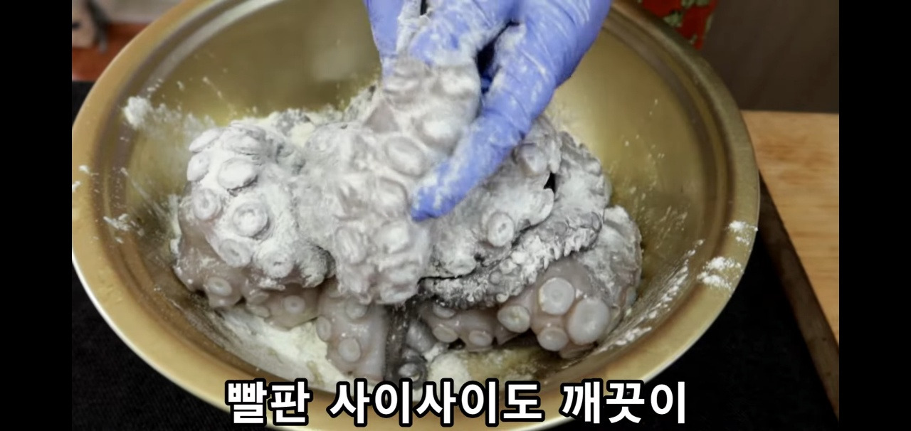문어를 삶기 전에 이물질과 비린내를 없애는 과정을 거쳐볼게요. 밀가루 한 컵을 문어에 골고루 뿌리고 잘 버무려주세요.