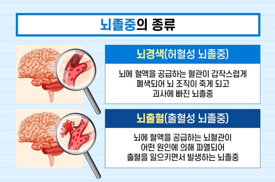 뇌졸중은 뇌출혈과 뇌경색을 모두 포함하는 용어입니다. 즉, 뇌졸중은 크게 두 가지 유형으로 나눌 수 있는데, 첫 번째는 뇌혈관이 막혀서 뇌의 일부가 손상되는 ‘뇌경색’이고, 두 번째는 뇌혈관이 터져서 그 주변의 뇌 조직이 손상되는 ‘뇌출혈’이에요.