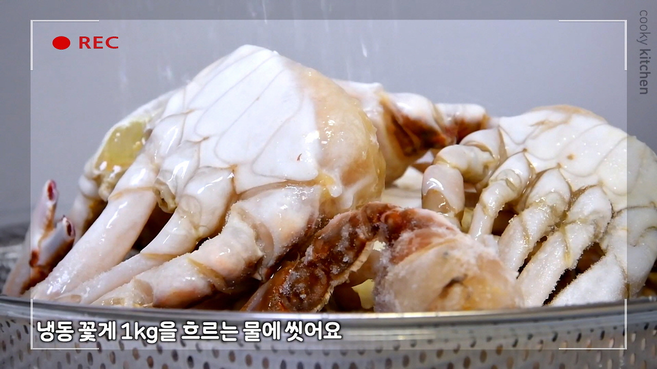 냉동 꽃게 1kg을 준비한 뒤, 흐르는 물에 깨끗이 씻어주세요.