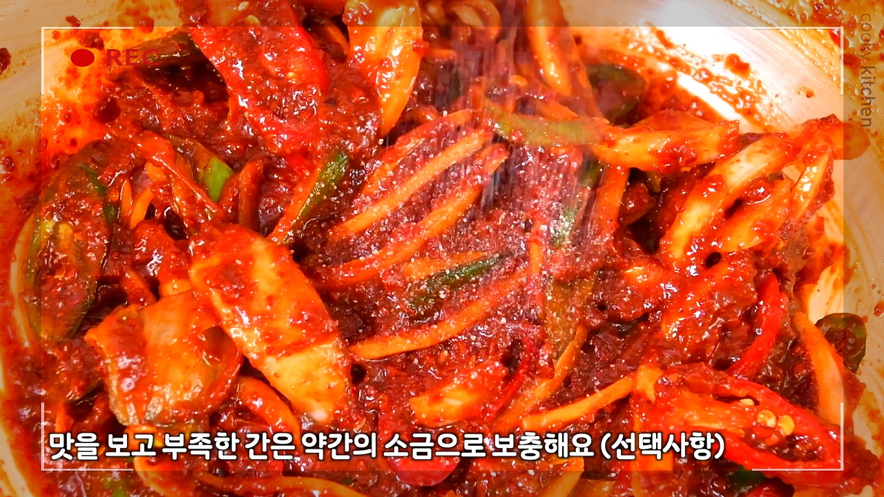 양념을 골고루 섞은 뒤, 고춧가루가 잘 흡수되도록 잠시 두세요.