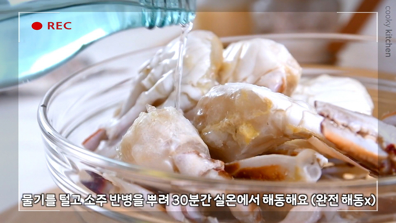 깨끗이 세척한 냉동 꽃게의 물기를 가볍게 턴 다음, 소주 반 병을 골고루 뿌려주세요. 그런 후, 실온에서 약 30분 동안 해동시켜주세요. 이때 완전히 해동되지 않도록 주의해 주시면 됩니다.