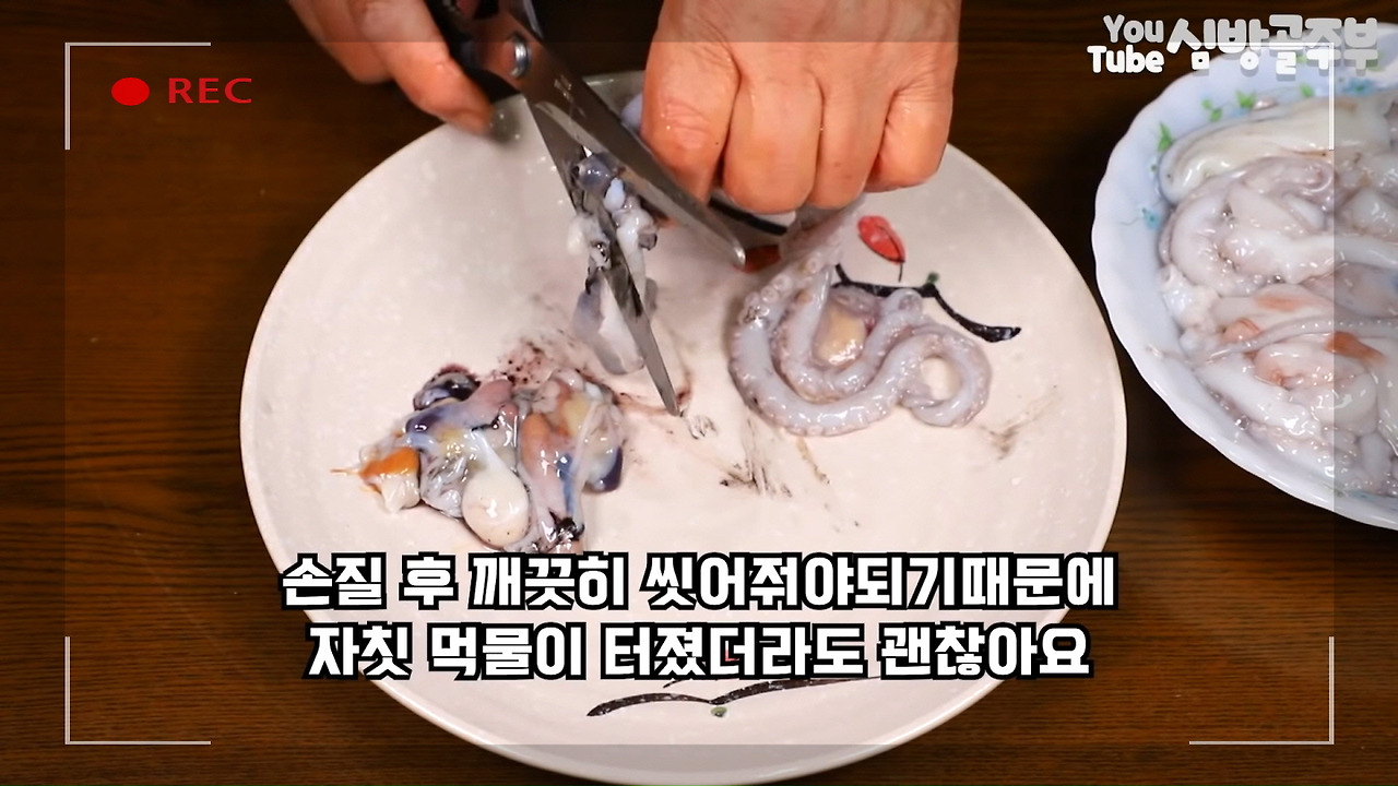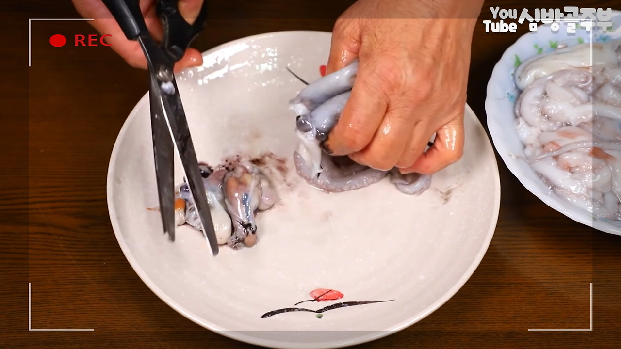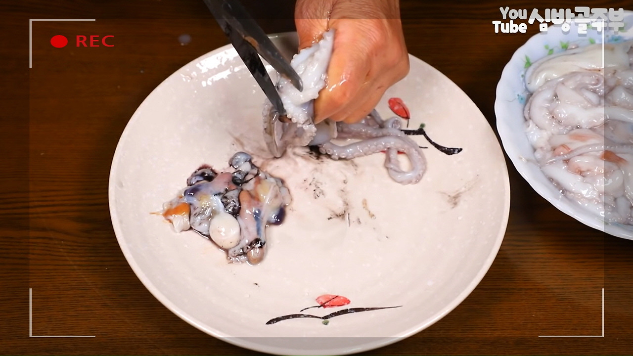 이렇게 뒤집은 상태에서 가위로 내장과 먹물을 잘라내면 더 수월하게 처리할 수 있어요.