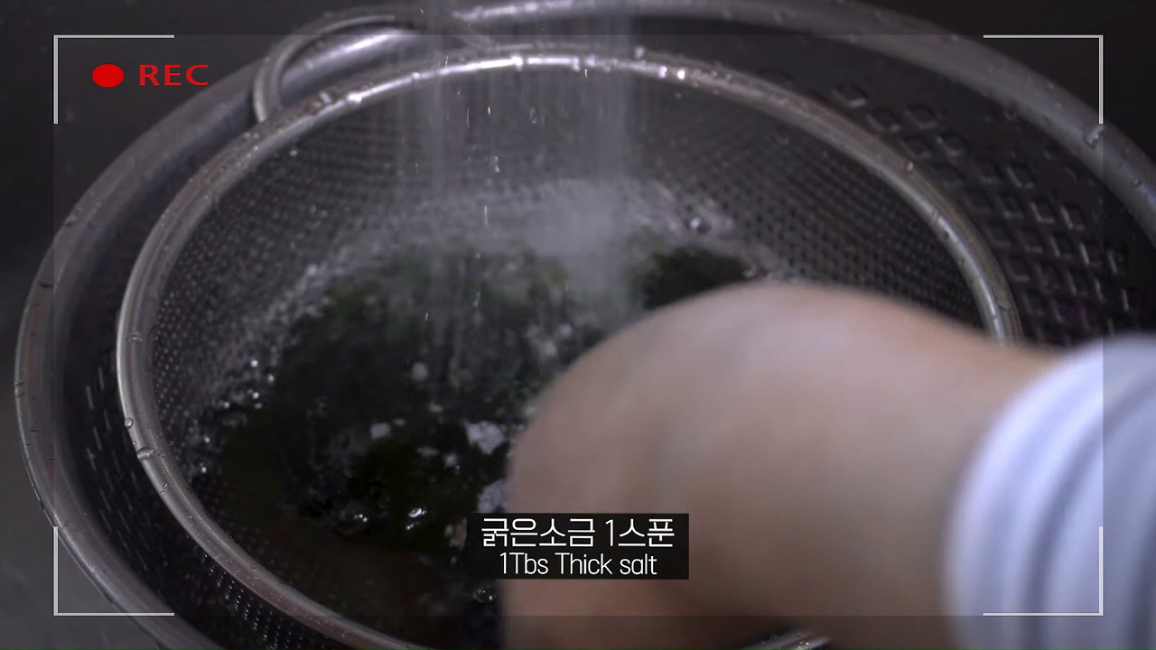 다음은 매생이를 씻을 차례입니다. 양푼에 매생이를 넣고 굵은 소금 1스푼을 넣은 뒤, 잘 풀어가며 씻어 주세요.