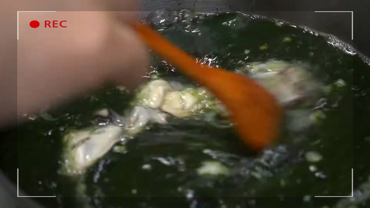 이제 본격적으로 매생이 굴국을 끓여보겠습니다. 우선 굴에 생강청 2스푼을 넣고 잘 비벼주면 굴에 남아있던 비린내가 사라져 더욱 깔끔한 매생이 굴국을 즐길 수 있습니다. 그다음, 국에 매생이를 조금씩 풀어 넣어주세요.
