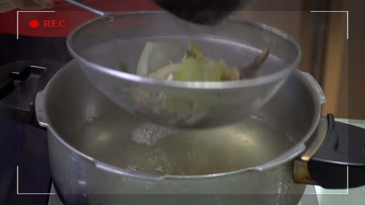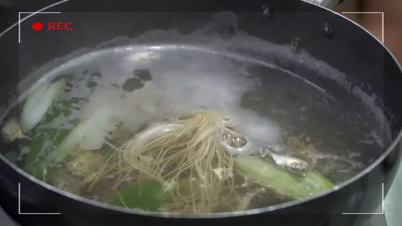아까 끓여두었던 매생이 굴국 육수에서 10분이 지난 후 다시마를 건져내고, 6~7분 더 끓인 뒤 나머지 건더기들을 모두 건져내면, 육수를 우려내는 과정이 끝납니다.