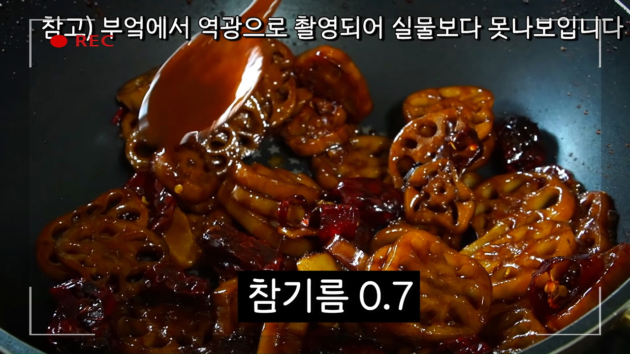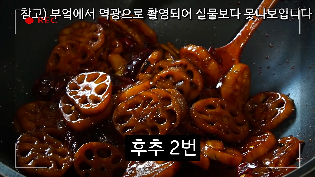 사진을 보면 흑설탕 덕분에 '엿실'이 가득하게 형성된 것을 확인할 수 있습니다. 이 덕분에 연근조림은 식어도 광택과 끈적임을 그대로 유지할 수 있는 비결이랍니다.