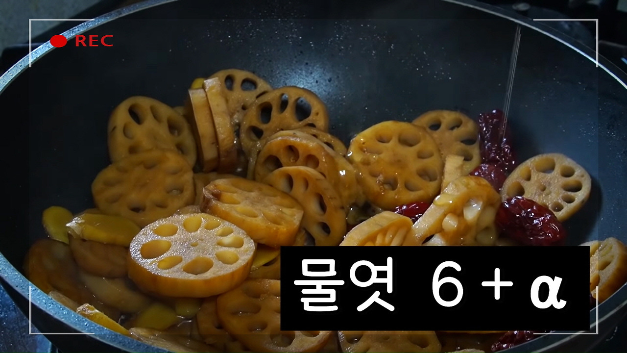 약 15분 정도 연근조림을 끓인 후, 국물이 조금 남았을 때 물엿을 넣어주세요. 물엿은 6스푼 정도 넣으면 적당해요.