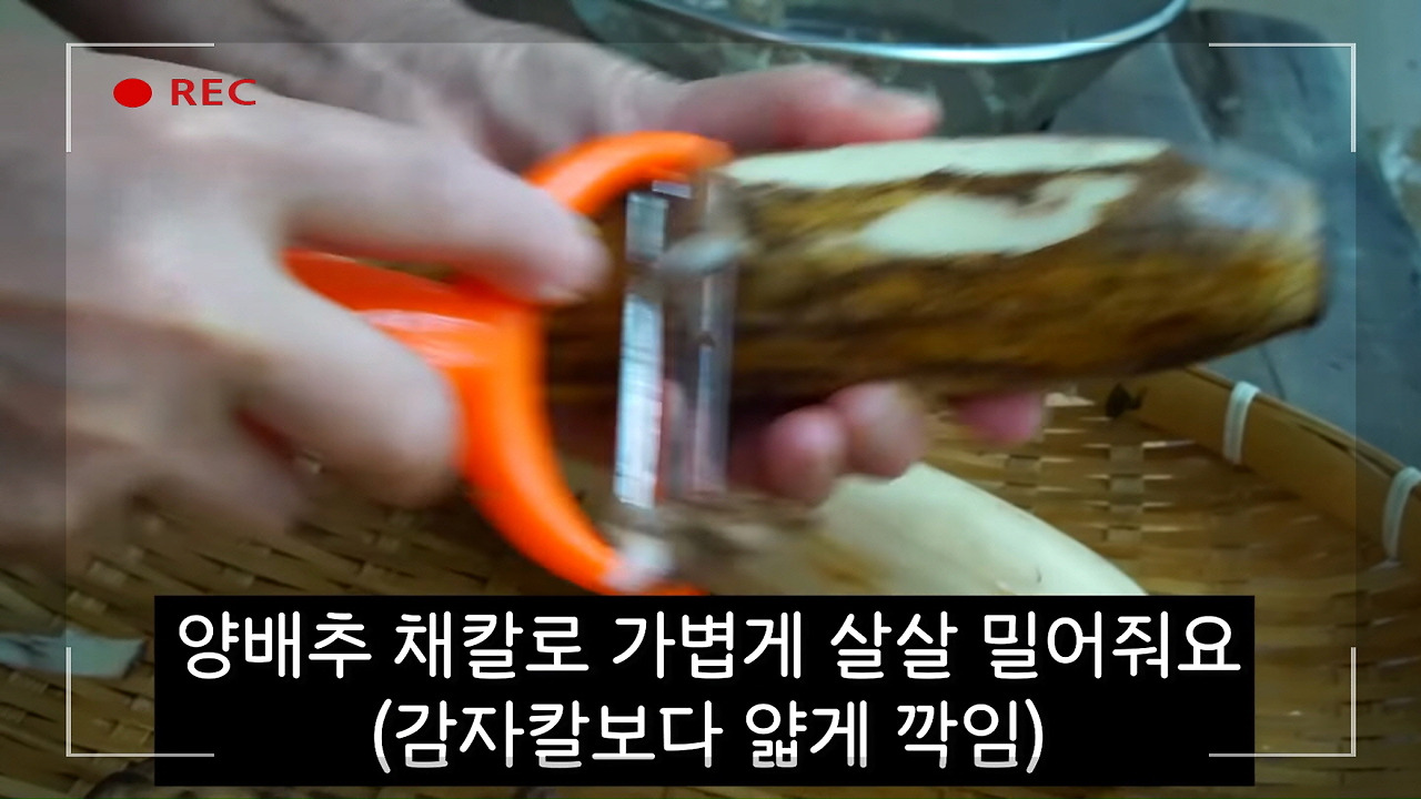 연근조림을 만들기 위한 첫 단계는 연근을 손질하는 거예요. 먼저 양배추 채칼이나 감자칼을 이용해 연근의 껍질을 깨끗하게 벗겨주세요.