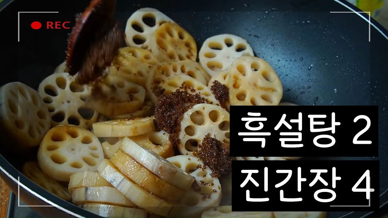 그 다음에는 진간장 4큰술과 흑설탕 2큰술을 넣어 연근조림에 색깔을 내주세요.