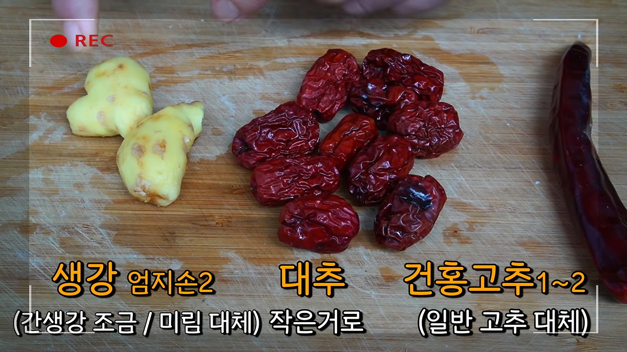 연근조림을 만들 때는 생강, 대추, 그리고 건홍고추(일반 고추도 괜찮아요)가 들어갑니다.