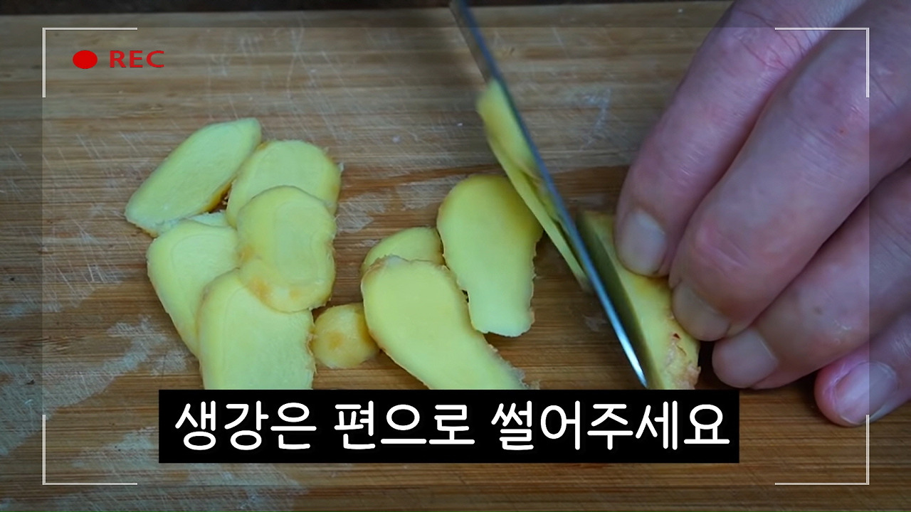 연근을 썰 때는 세게 치지 말고, 0.5cm 정도의 두께로 조심스럽게 썰어주세요.