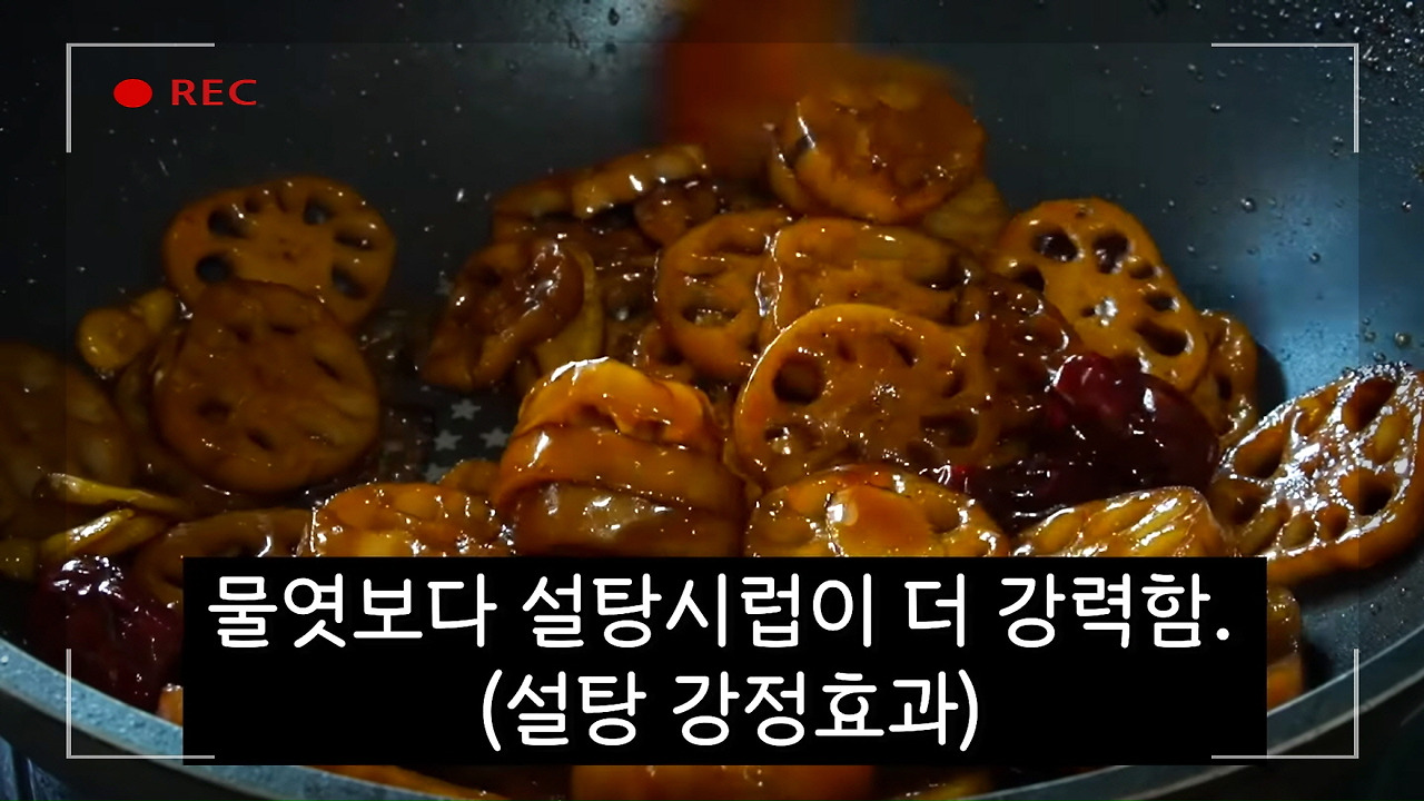 국물이 사라지고 엿실이 서로 엉겨붙으면 연근조림이 완성된 거랍니다.