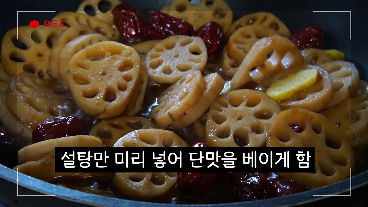 그 다음에는 준비해둔 대추와 생강을 넣고 불을 낮춰주세요. 뒤적이며 약한 불에서 연근조림이 잘 조려지도록 익혀주시면 됩니다.