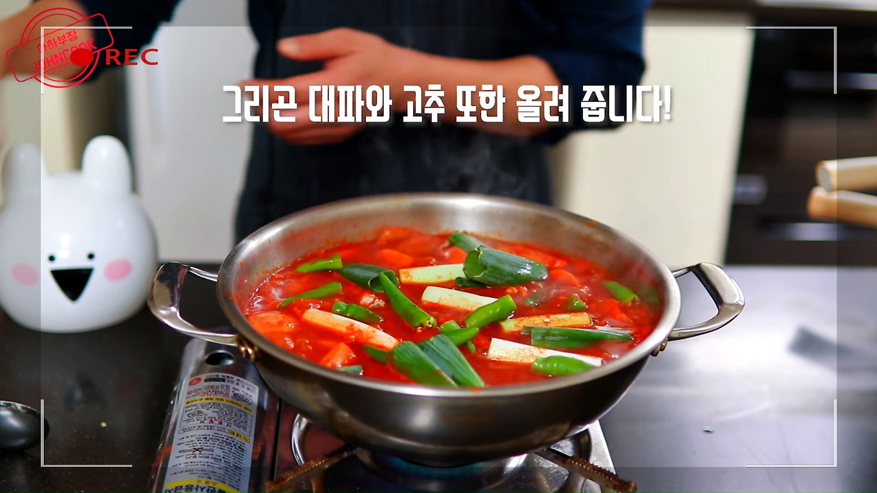 그다음, 잡내를 없애줄 대파와 칼칼한 맛을 더해줄 고추를 닭볶음탕에 넣어주세요. 이렇게 하면 전체적으로 깔끔한 맛의 베이스가 완성됩니다.