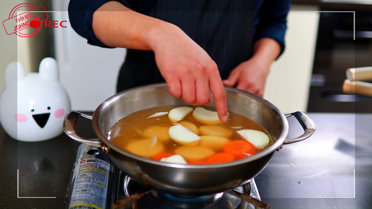 물이 끓기 시작하면, 당근, 양파, 감자를 모두 함께 넣어주세요.