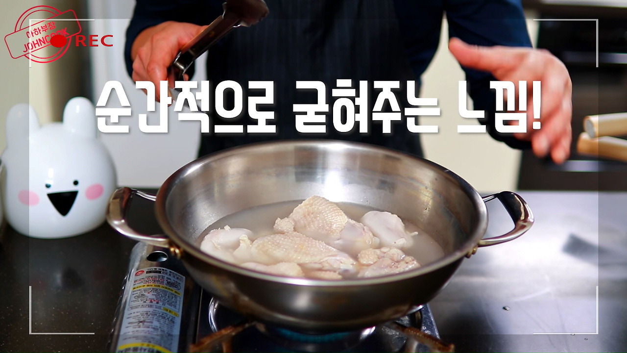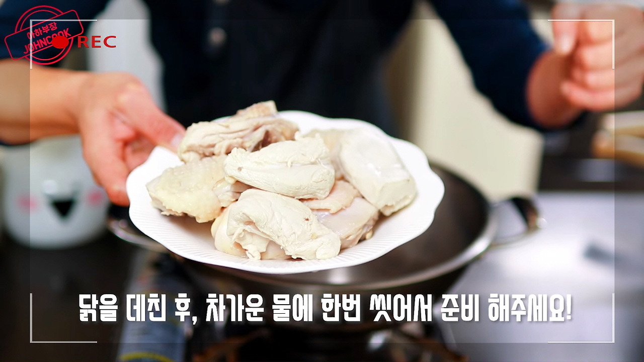 닭을 넣고 물이 다시 끓어오르면, 닭을 바로 빼주세요. 겉만 살짝 데친다는 느낌으로 해주시면, 닭의 잡내가 확실히 줄어든답니다.