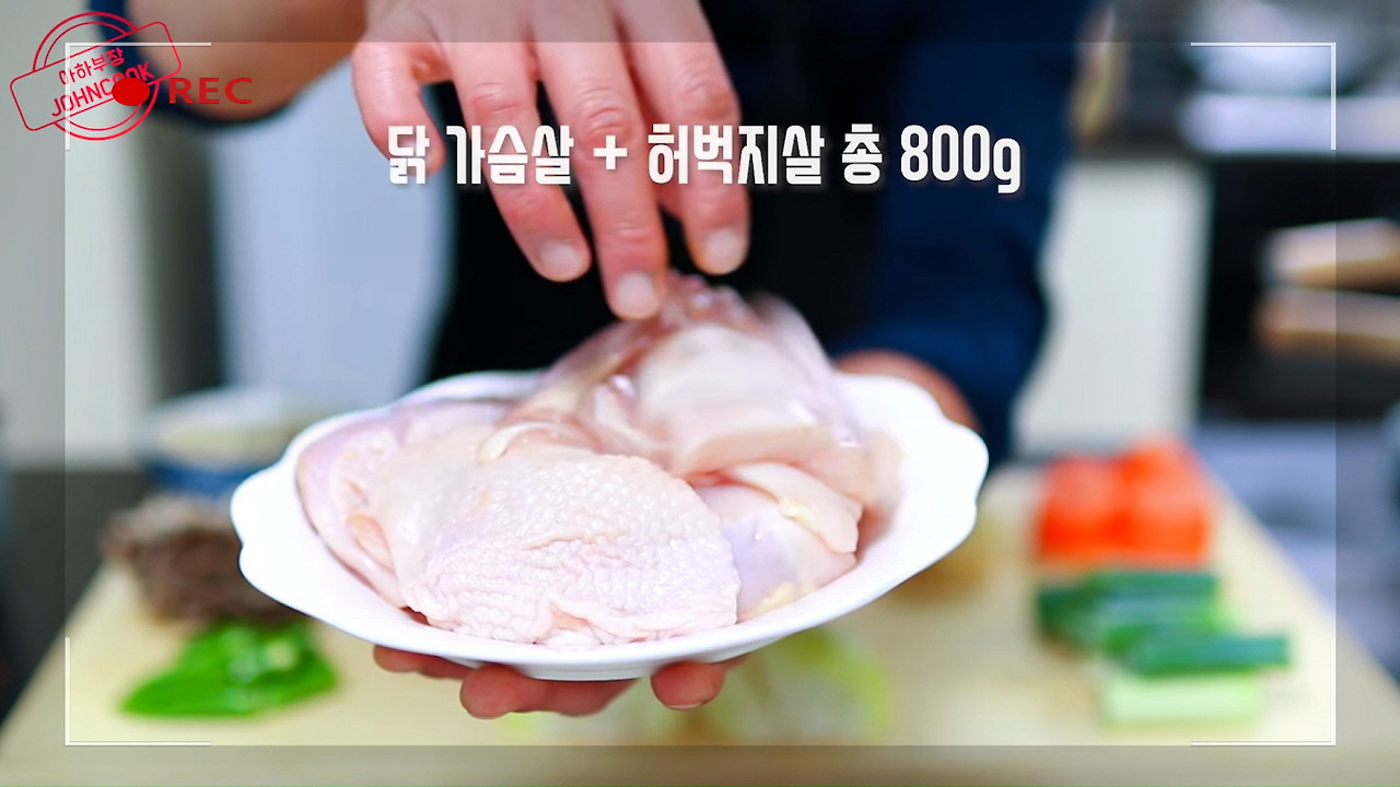 떡볶이 떡은 선택사항이에요. 넣어주셔도 되고, 없으면 생략하셔도 괜찮습니다. 마지막으로, 이번 닭볶음탕 레시피에는 닭가슴살과 닭허벅지살을 합쳐서 800g 정도 준비해 주세요.