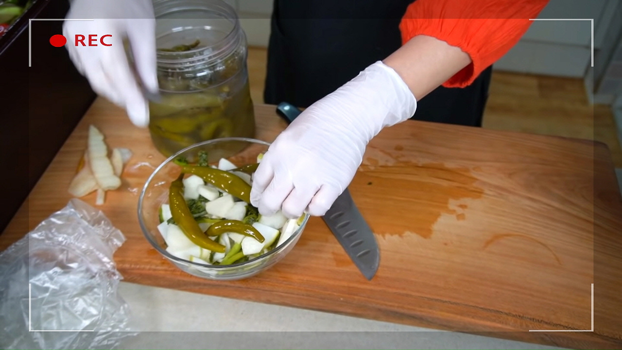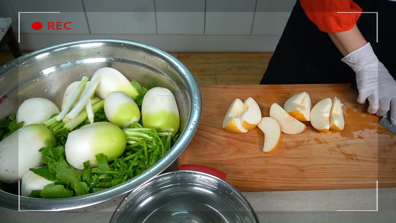 배는 겉부분이 노랗게 변한 부분을 칼로 잘라내고, 속 알맹이는 얇게 썰어서 동치미에 넣어주세요. 집에 삭힌 고추가 있으시면 동치미에 함께 넣어 드셔도 좋습니다.