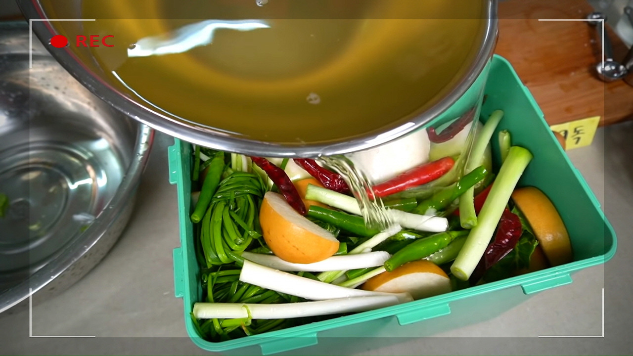 그리고 준비한 동치미 육수를 부어 주세요. 이제 동치미 재료들과 육수가 잘 섞일 준비가 다 되었습니다.