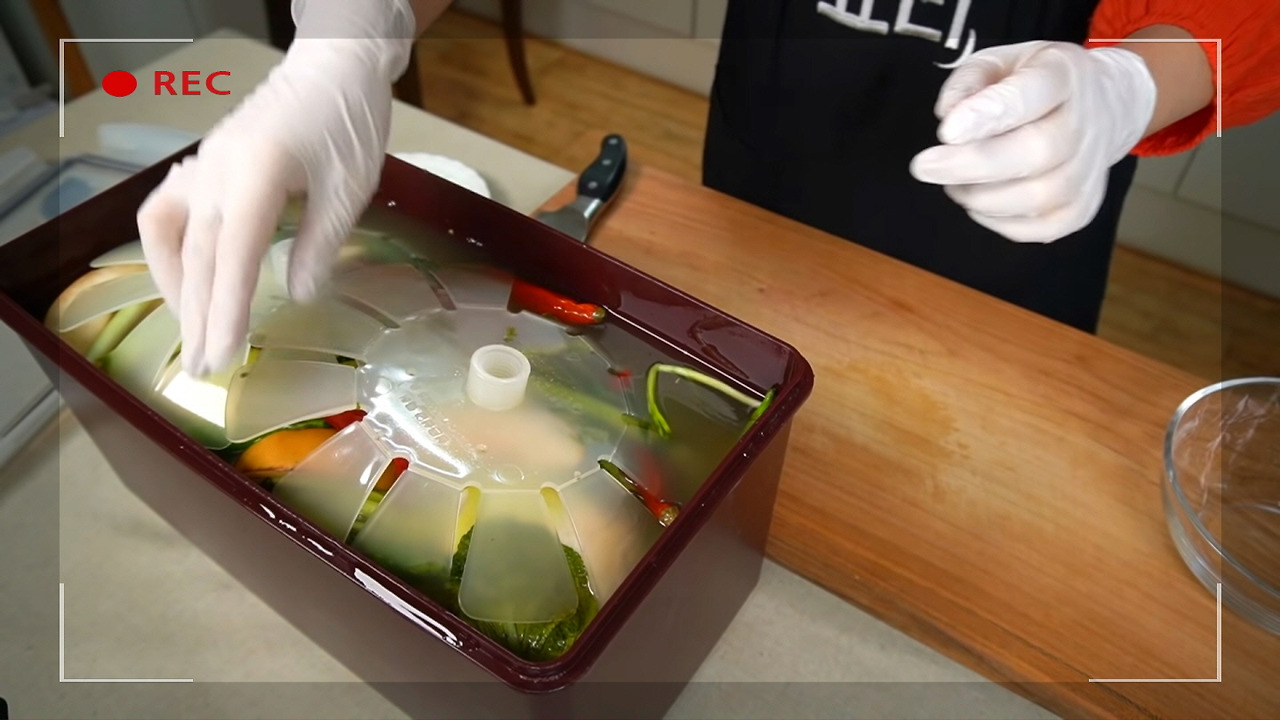 누름기가 있다면 재료를 눌러서 뚜껑을 덮어 주세요. 누름기가 없다면 그냥 덮으셔도 괜찮아요. 중요한 것은 재료들이 충분히 잠길 정도로 부어주는 거예요. 그리고 다시마는 2시간 후에 꼭 빼 주세요. 그렇지 않으면 끈적거려서 안 좋을 수 있어요. 이렇게 동치미를 맛있게 담는 과정은 모두 끝났습니다. 이제 실온에서 일주일 정도 숙성시키면 완성됩니다.