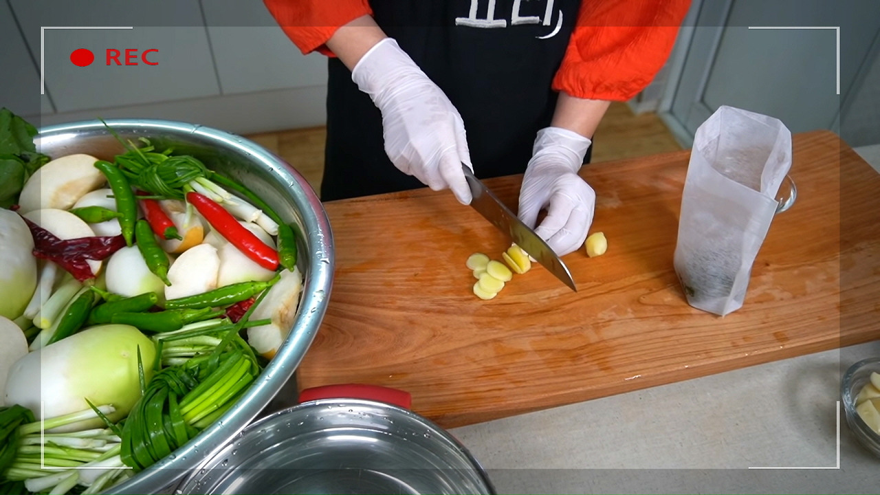생강과 마늘은 얇게 편으로 썰어서 포에 넣은 후, 김치통의 맨 아래에 깔아 주세요. 이렇게 하면 동치미의 맛이 더욱 깊고 감칠맛이 살아나요. 이제 재료 손질이 끝났으니, 동치미 담는 다음 단계를 알아보도록 할게요.