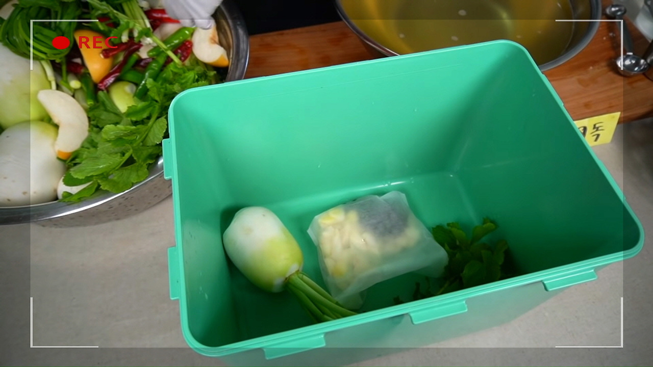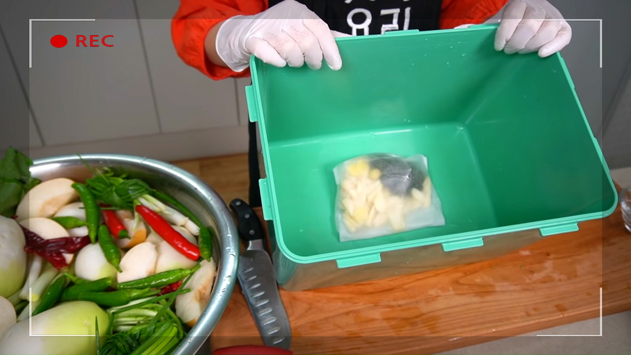 마지막으로, 본격적으로 동치미를 맛있게 담는 방법을 알아볼게요. 김치통 바닥에 포를 깔아준 후, 준비한 동치미 재료들을 하나씩 차례대로 쌓아 주세요.