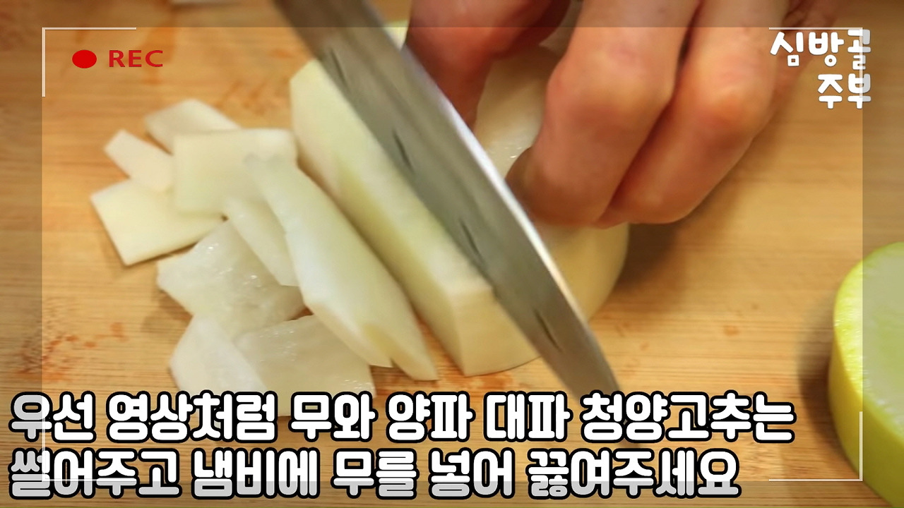 먼저 무는 한 숟가락에 담기기 좋은 크기로 잘라주세요. 만약 식감을 더 살리고 싶다면 조금 두툼하게 썰어도 괜찮습니다. 이렇게 하면 굴국이 더욱 시원한 맛을 내면서도 부드러운 식감을 즐길 수 있어요.