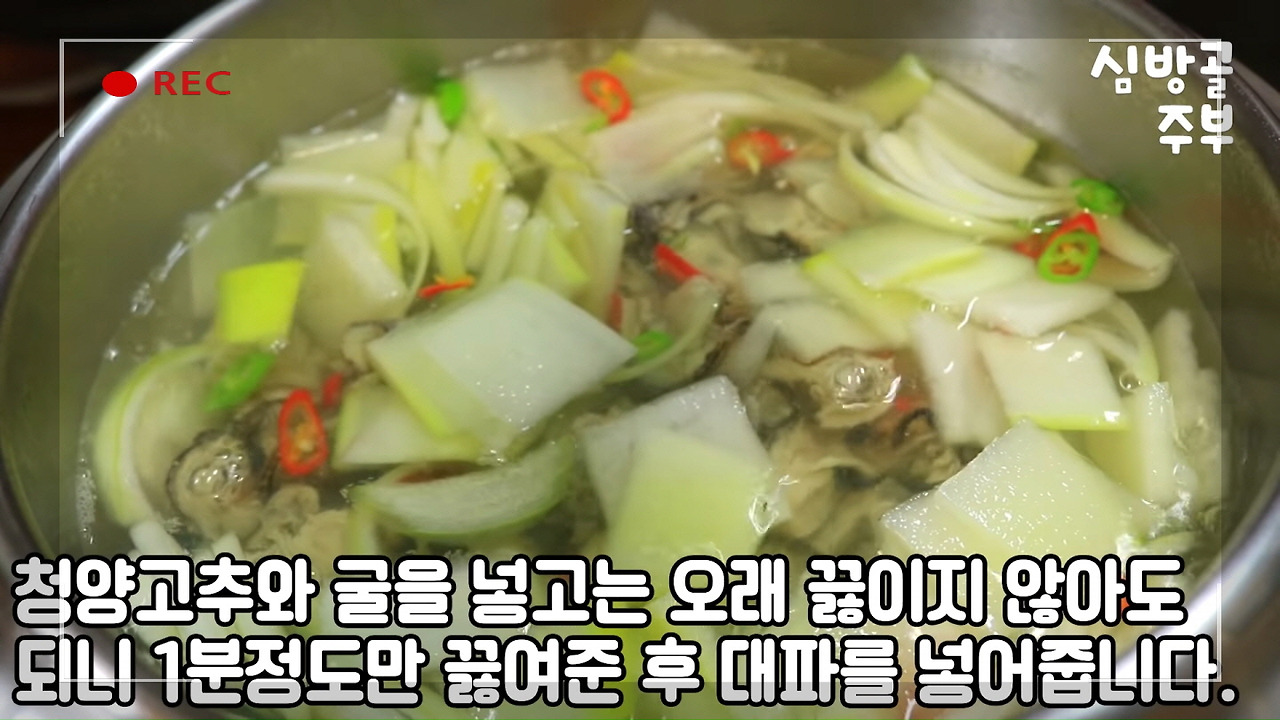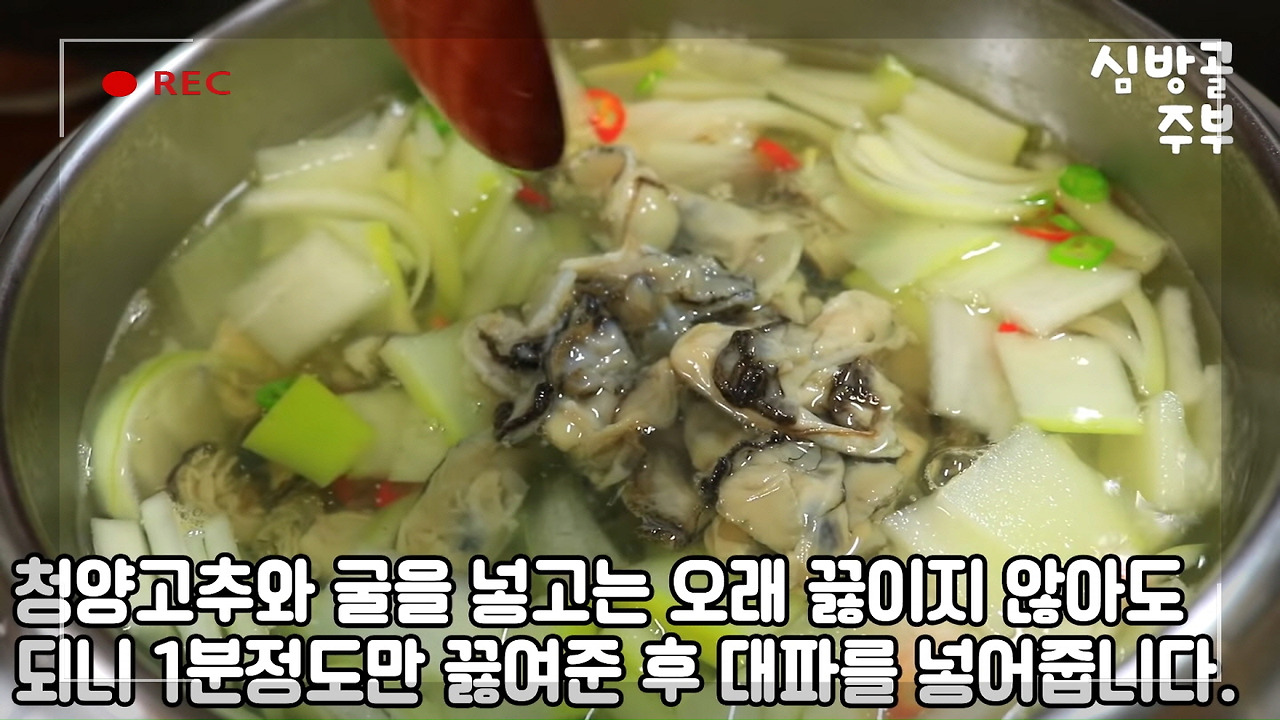 청양고추와 굴을 넣은 뒤, 너무 오래 끓이지 않고 약 1분 정도만 끓여주세요. 그 후 대파를 넣어 마무리해 줍니다.