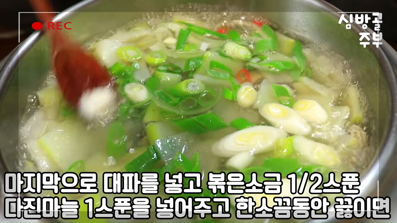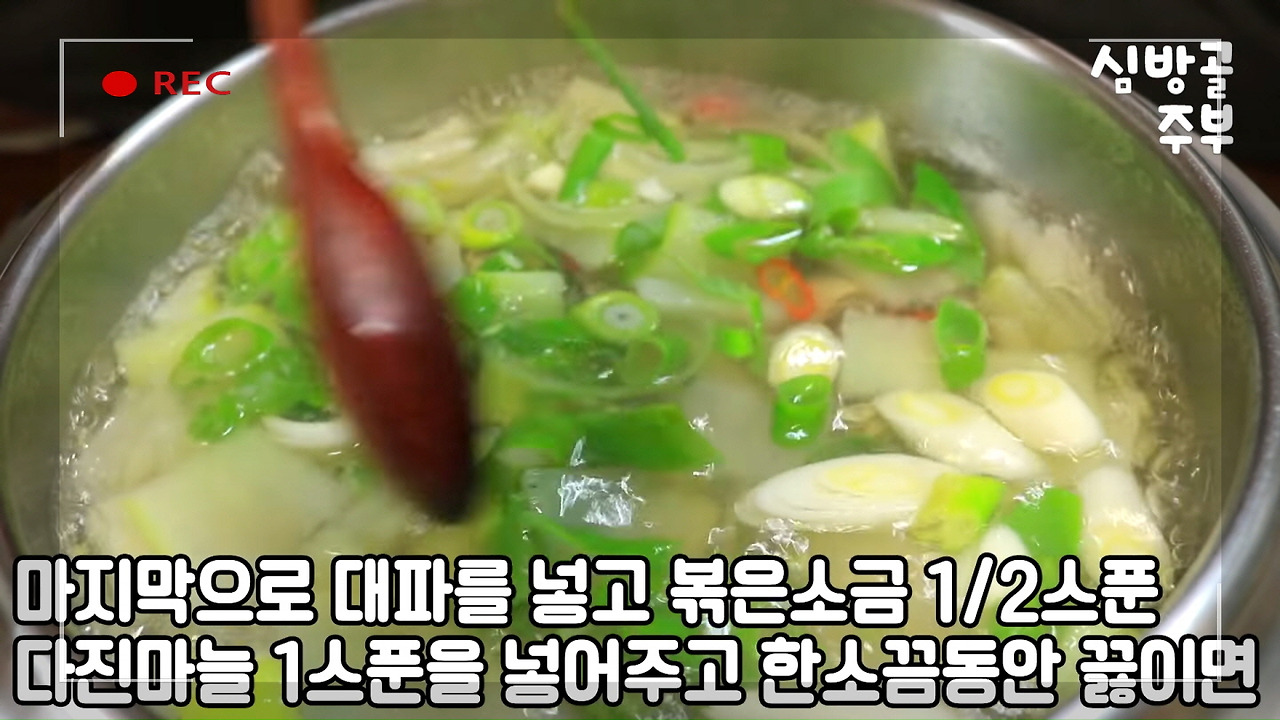 마지막으로 대파를 넣고, 볶은 소금 1/2스푼과 다진 마늘 1스푼을 넣어주세요. 이렇게 하면 굴국에 딱 맞는 간과 깊은 감칠맛이 더해집니다. 남아있을 수 있는 잡내도 깔끔하게 잡아줘, 정말 맛있고 깔끔한 굴국이 완성됩니다.