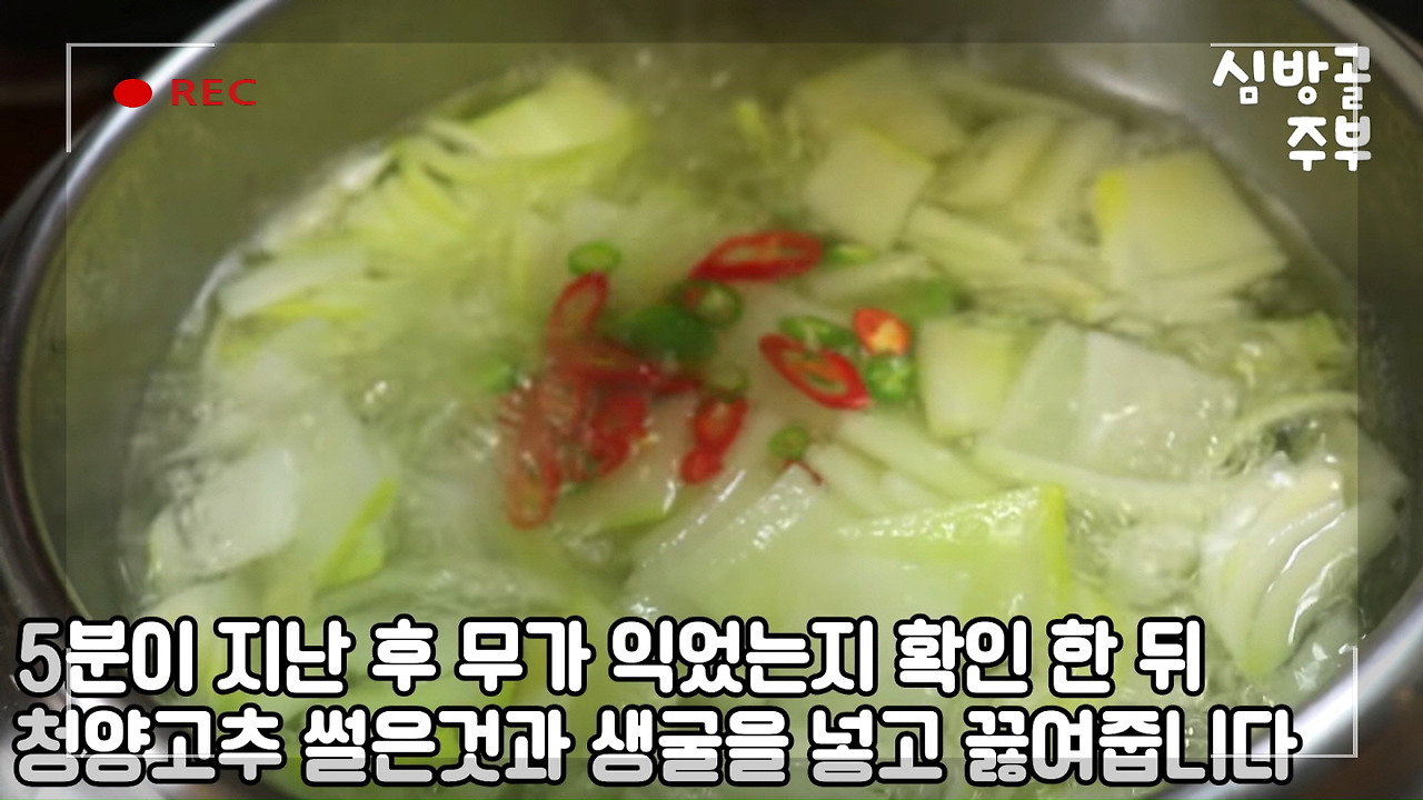 추가로 5분 정도 더 끓인 뒤, 무가 잘 익었는지 확인하고 청양고추와 손질한 생굴을 넣어주세요. 칼칼한 청양고추의 맛과 담백한 굴의 향이 어우러지면서 한층 깊고 맛있는 굴국이 완성됩니다.
