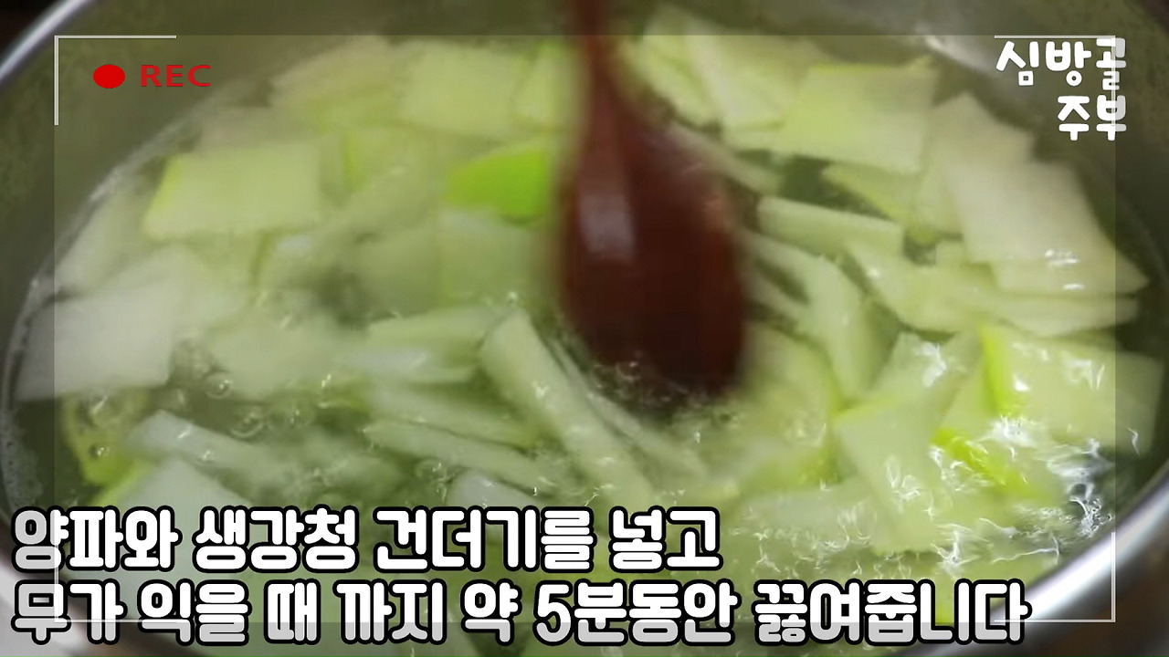 물이 끓어오르면 양파와 생강청 건더기를 넣고, 무가 충분히 익도록 약 5분 정도 더 끓여주세요.