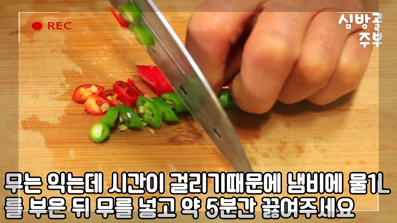 청양고추도 잘게 썰어주면, 오늘 준비할 굴국 재료 손질이 모두 완료됩니다.