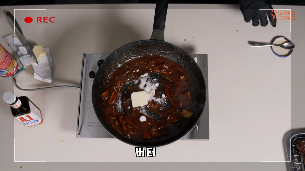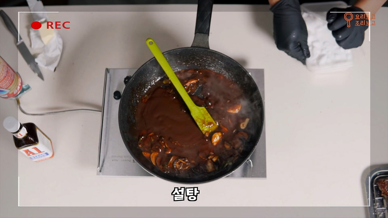 여기서 가장 많이 사용되는 에이 원 소스와 설탕 1큰술을 넣어주세요. 설탕은 신 맛을 부드럽게 잡아주고, 스테이크 소스에 단맛을 더해주어 더욱 맛있는 스테이크를 즐길 수 있습니다.